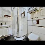 Bathroom facilities also include a separate toilet and a shower. There are hairdryers and towels for guests' comfort.